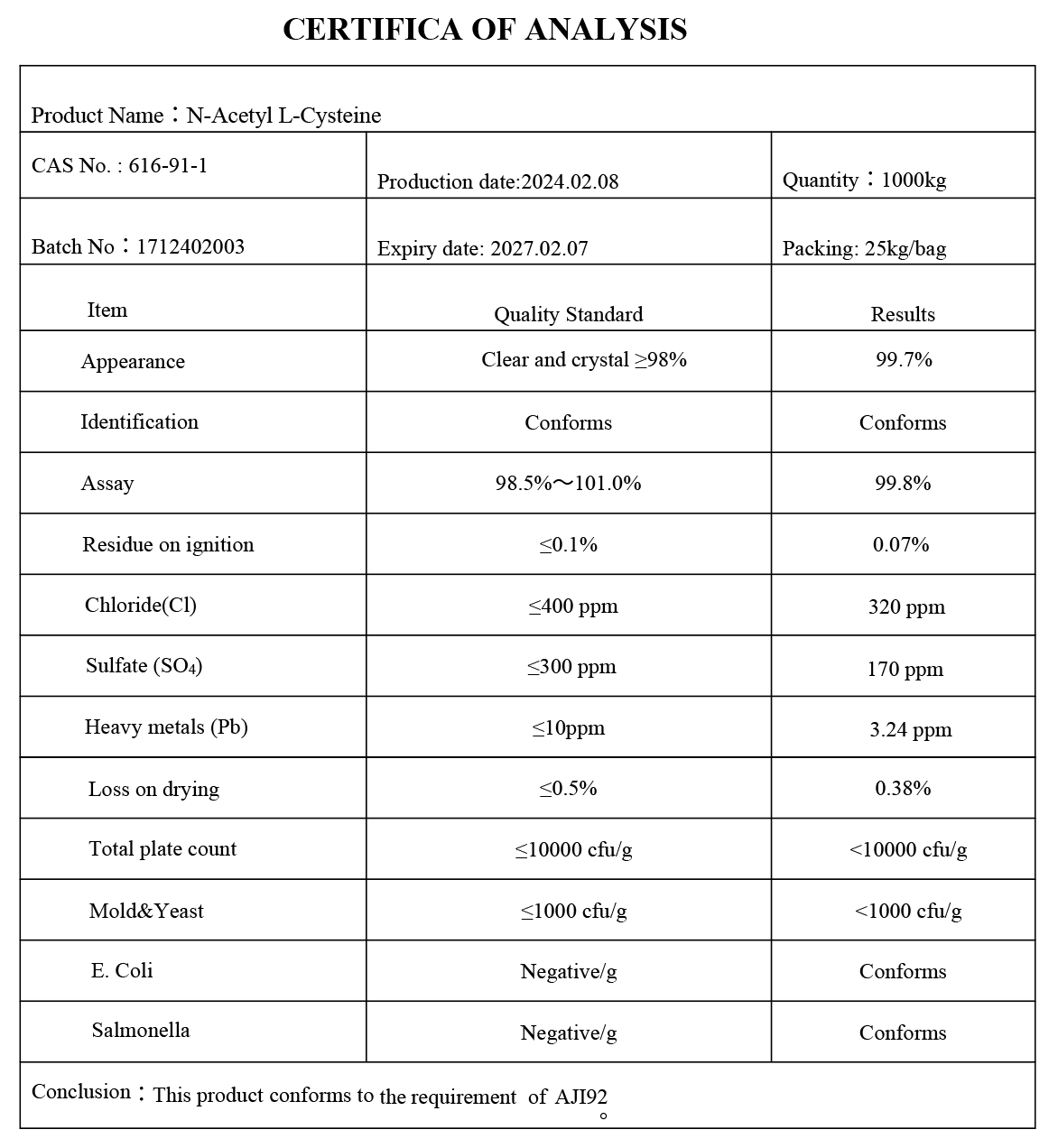 %100 Saf N-Acetyl L-Cysteine