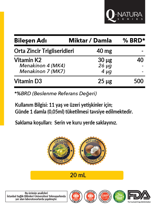 İçindekiler: Orta zincir trigliseridleri, Menakuinon 7 (Taşıyıcı: Zeytinyağı, Vitamin K2), Taşıyıcı: Zeytinyağı, Kolekalsiferol (Taşıyıcı: Zeytinyağı, Vitamin D3), Menakuinon 4 (Taşıyıcı: Zeytinyağı, Vitamin K2).