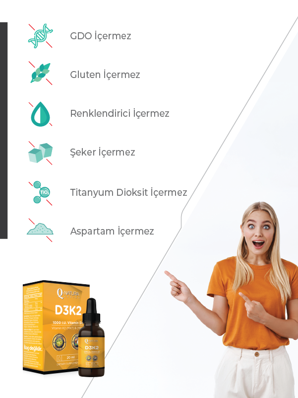 Öykü Q Natura Series, içeriğindeki yüksek kaliteli Vitamin K2 ve Vitamin D3 ile vücudunuzun ihtiyaç duyduğu temel besin maddelerini sunar. Her damla, doğal kaynaklı Orta Zincir Trigliseridleri ile zenginleştirilmiş, dengeli bir formül sunar.
