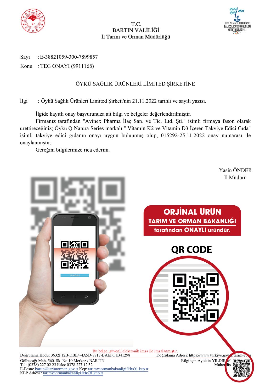 Öykü Q Natura Series, TR-34-K-185221 numaralı işletme kaydıyla üretilmiş olup, 015292-25.11.2022 numaralı takviye edici gıda onayına sahiptir. Türkiye menşeili bu ürünü güvenle kullanabilirsiniz.