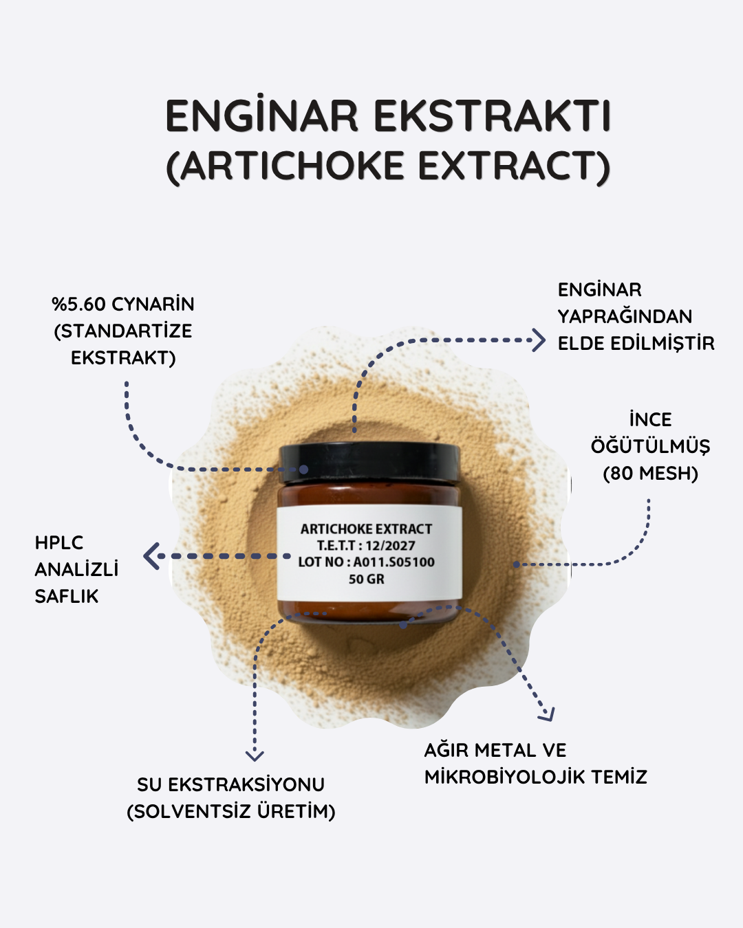 Artichoke Extract (Enginar Ekstraktı), enginar bitkisinin yapraklarından elde edilen, yüksek antioksidan kapasitesi ve karaciğer destekleyici özellikleriyle bilinen doğal bir bitkisel hammaddedir. Takviye üretimi, bitkisel karışımlar, Ar-Ge çalışmaları ve fonksiyonel gıda formülasyonları için ideal yapıda, ince toz formdadır.
