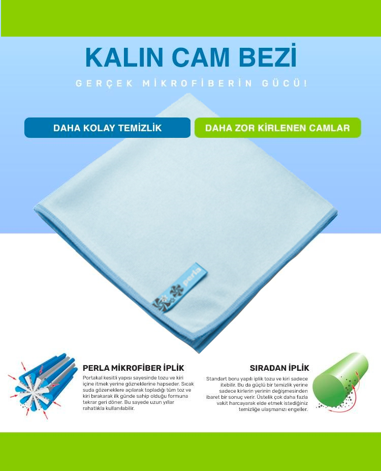 Perla Kalın Cam Bezi, yüksek kaliteli kalın cam liflerinden üretilmiş bir temizlik bezi olarak tasarlanmıştır. Özel dokusu sayesinde cam yüzeylerde etkili temizlik sağlar.